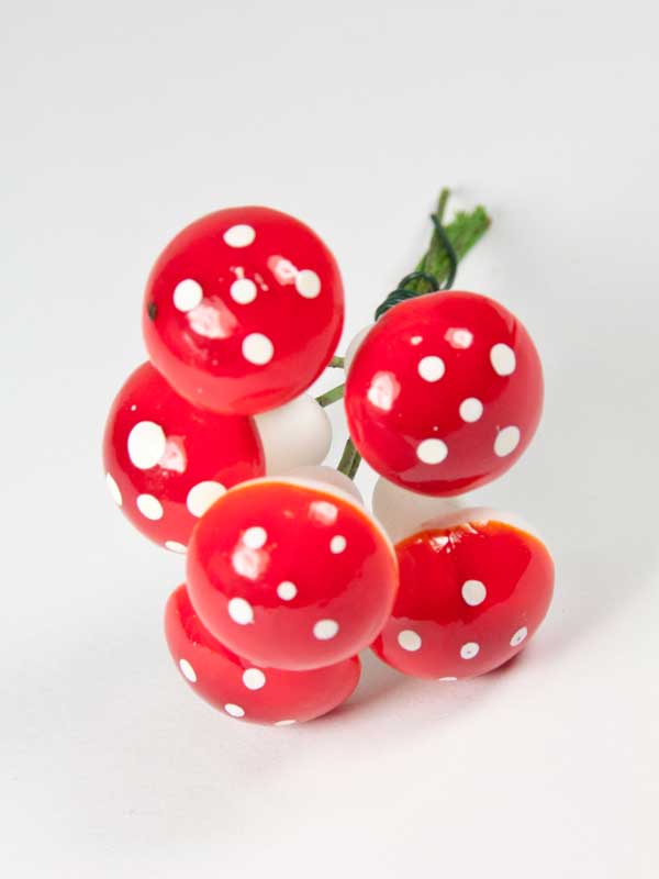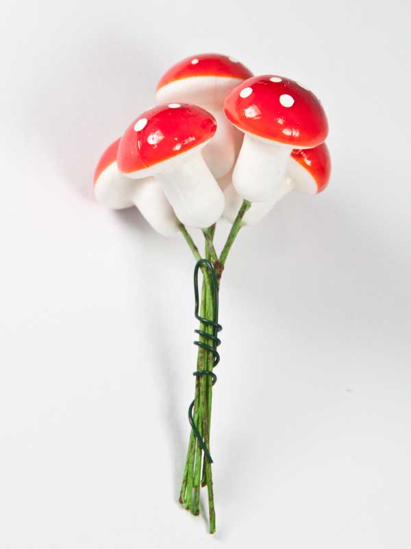 Paddestoel op draad gebundeld per 6. Deze paddenstoelen kunnen goed gebruikt worden als decoratie in bijvoorbeeld kerststukjes.